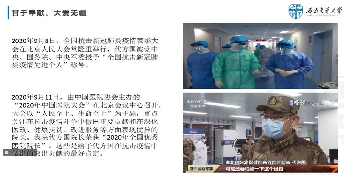 自立项以来,临床第二党支部同西部战区总医院卫勤训练中心党支部建立了联系,通过卫勤训练中心联系到代方国、林宁及何思毅三位军医。同时将党支部分为3个小组,每个小组分工完成采访稿撰写、整理资料、宣传资料制作、视频拍摄等工作。通过梳理他们是如何行医的、在部队是如何工作的;以及通过他们军人军貌的讲述,介绍他们如何走上医学这条道路的,如何奉献自己,为党为民身体力行的。写作”医者“宣传稿3篇,拍摄”医者“微视频1个。党员们在学习这些事迹时受到了良好的教育。例如代方国在03年非典、武汉新型冠状病毒肺炎的疫情抗击战中,一直奋战在抗击疫情的第一线。大家了解他们将毕生事业始终与国家与社会需要紧紧联在一起,展现大医之大爱。党员的反馈说他们的岗位虽有职称的不同,但不变的是,他们始终坚守医生岗位,兢兢业业救死扶伤,永远把病人放在首位,以高超的技术,为患者保驾护航。
