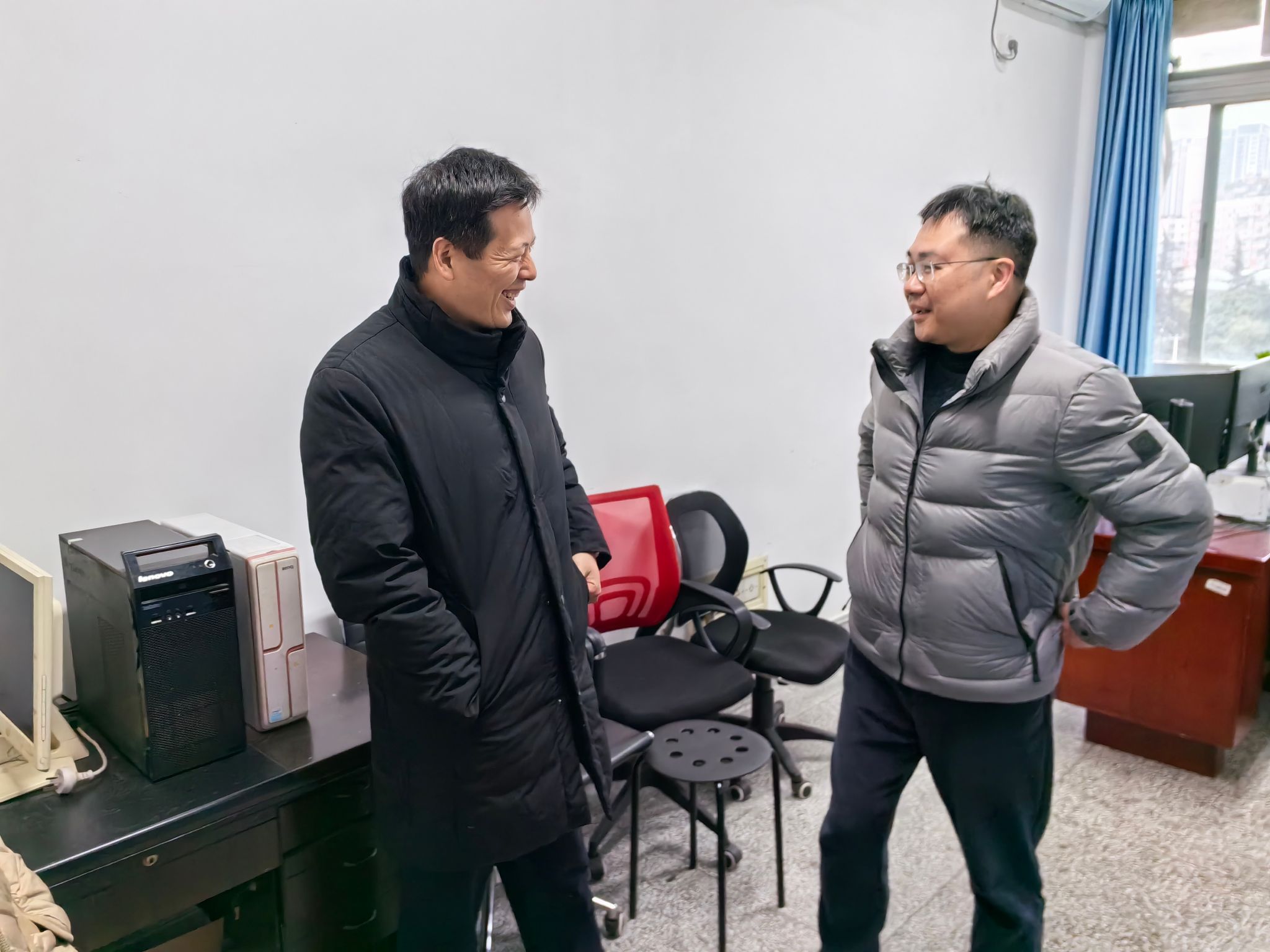 教师工作间,与全体教师就新学期教学准备、科研情况等情况进行交流,并对老师们认真的教学态度、充足的教学准备表示了肯定。