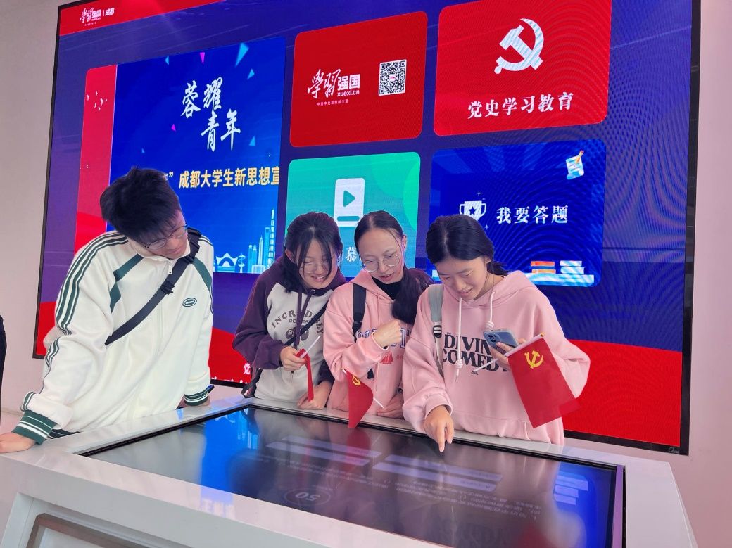 作为宣传习近平新时代中国特色社会主义思想、宣传“四史”以及开展党史学习教育的创新载体,成都市“学习强国”主题街区具有十分丰富的学习资源。在讲解员的引导下,党员同志们先后参观了“强国学苑”、“学习之家”、“学习广场”三大场景。党员们一路讨论,一路深思,共同回顾了中国共产党筚路蓝缕、艰辛奋斗的百年历程,深受鼓舞和震撼。参观结束后,学生党员们纷纷表达了自己的强国志、报国梦,彰显了当代青年的责任与担当。