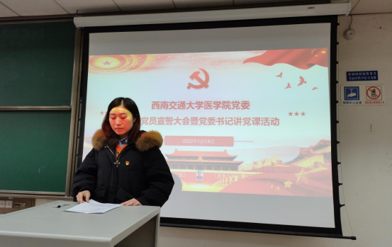 议程第三项,预备党员代表姚权洲同志发言。他首先从自己参军入伍期间的亲身经历出发讲述了自身明确入党动机、坚定入党信念的心路历程。接着回顾了一百多年以来,在中国共产党的团结带领下,中华民族和中国人民迎来了从站起来、富起来到强起来的伟大转变。他表示,党员不仅是一种身份,更是一种责任,要向无数党员前辈学习,尽自己所能地为人民服务。最后,他代表全体新预备党员向党组织做出了庄严承诺:我们努力加强党性修养,树立正确的世界观、人生观和价值观,把个人理想融入到党和国家事业中,同时不断加深对党的路线、方针、政策的认识和理解,改正自身的缺点和不足,更会遵守医学生誓言,贡献自己的智慧和青春,无愧中国共产党党员的称号。