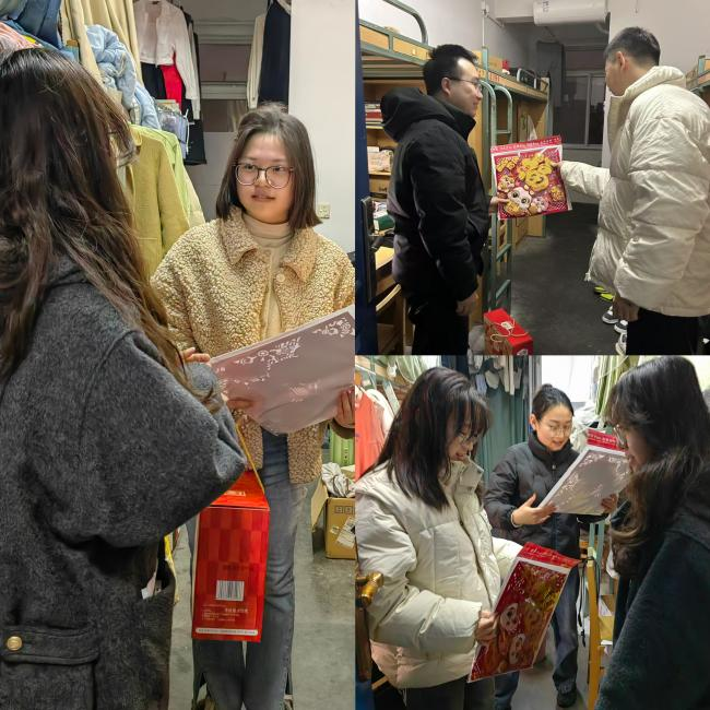 走访慰问寒假留校学生,叮嘱学生留校期间安全注意事项,并向留校学子表达新春祝福、赠予春节大礼包。