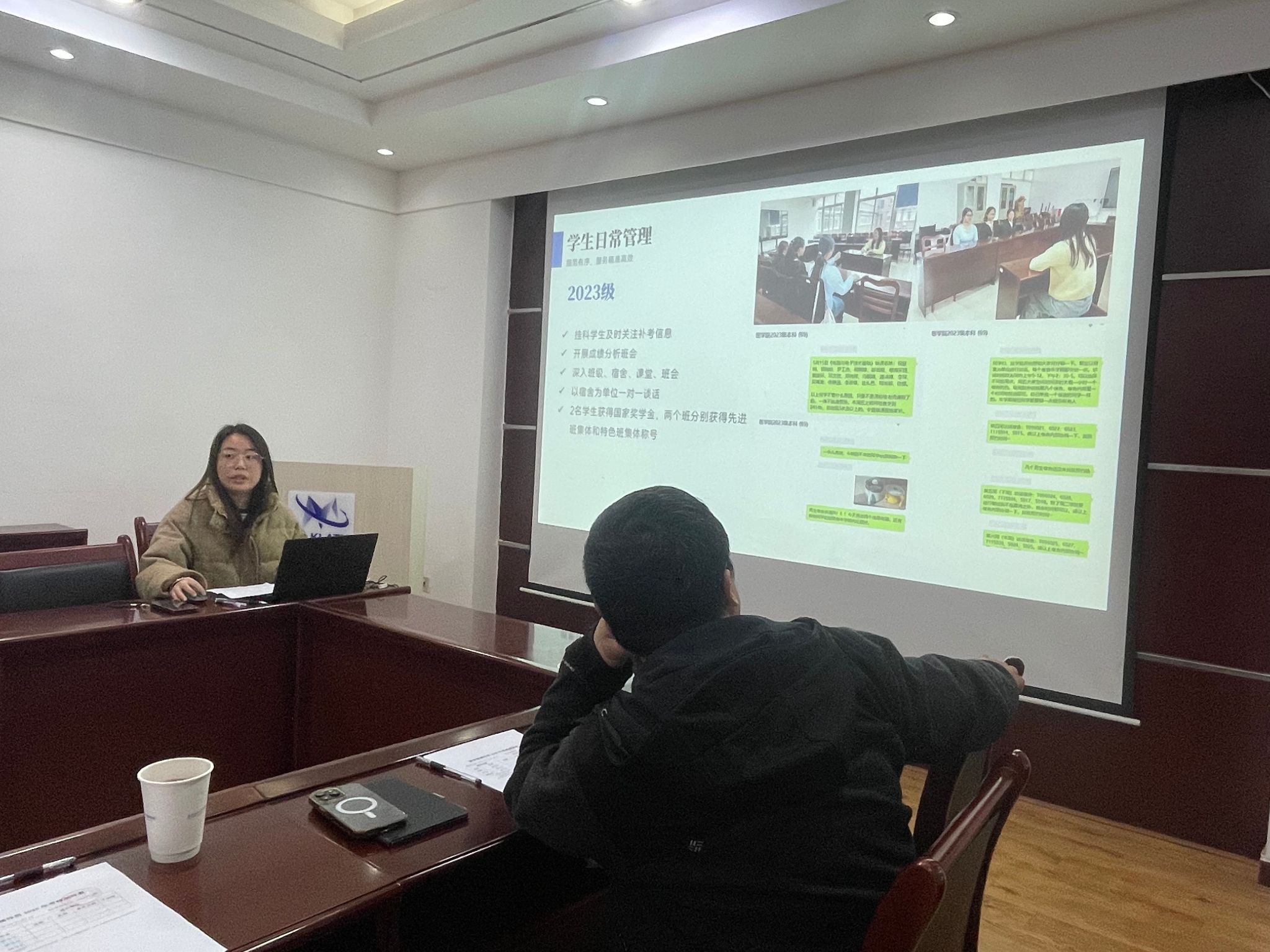 会上,学工组副组长胡豪、专职辅导员靳涵、免研辅导员廖柯琳、兼职辅导员韩鹏飞依次作述职报告。各位辅导员紧扣思想理论教育与价值引领、党团及班级建设、学业指导与学风建设、日常事务管理、心理健康教育咨询、职业规划与就业创业指导等核心职责,全面总结了过去一年的工作内容、显著成效,分享了育人经验与成长感悟,深刻剖析了工作中存在的不足,并明确了下一步的改进方向与工作思路。