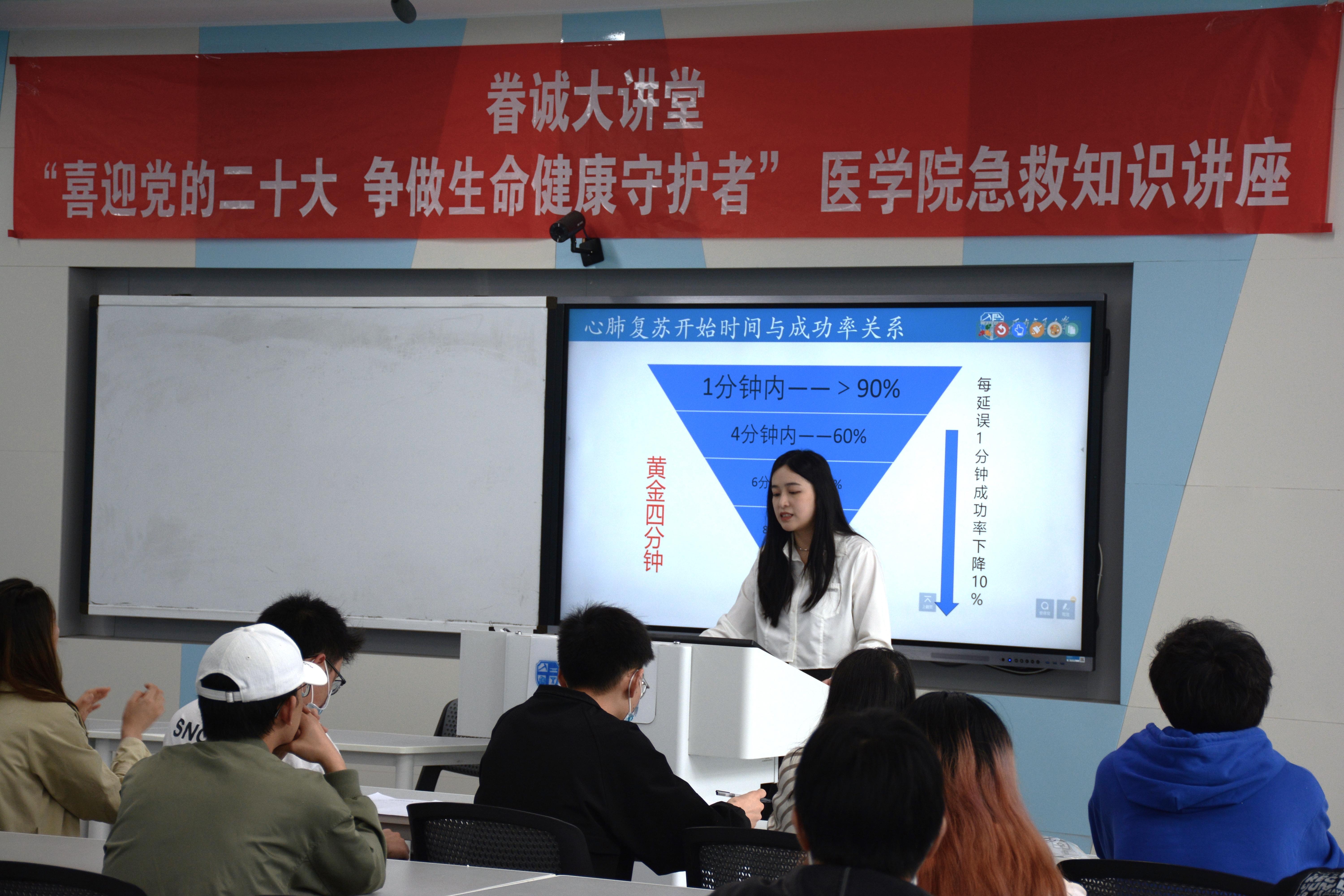 随后,晏唯同学通过图文并茂的PPT,结合自身作为医学生的实践经验,就“为什么学习心肺复苏”、“什么是心肺复苏”以及“怎样进行心肺复苏”三个方面进行了专业、风趣的理论讲述。学习心肺复苏是基于现实的需要,一方面,不到1%的心肺复苏普及率无法应对多发、频发的心跳呼吸骤停事故;另一方面,全球最快的120急救反应时间也长于心肺复苏抢救的”黄金四分钟“,这就要求我们尽可能的进行现场的、及时的心肺复苏。