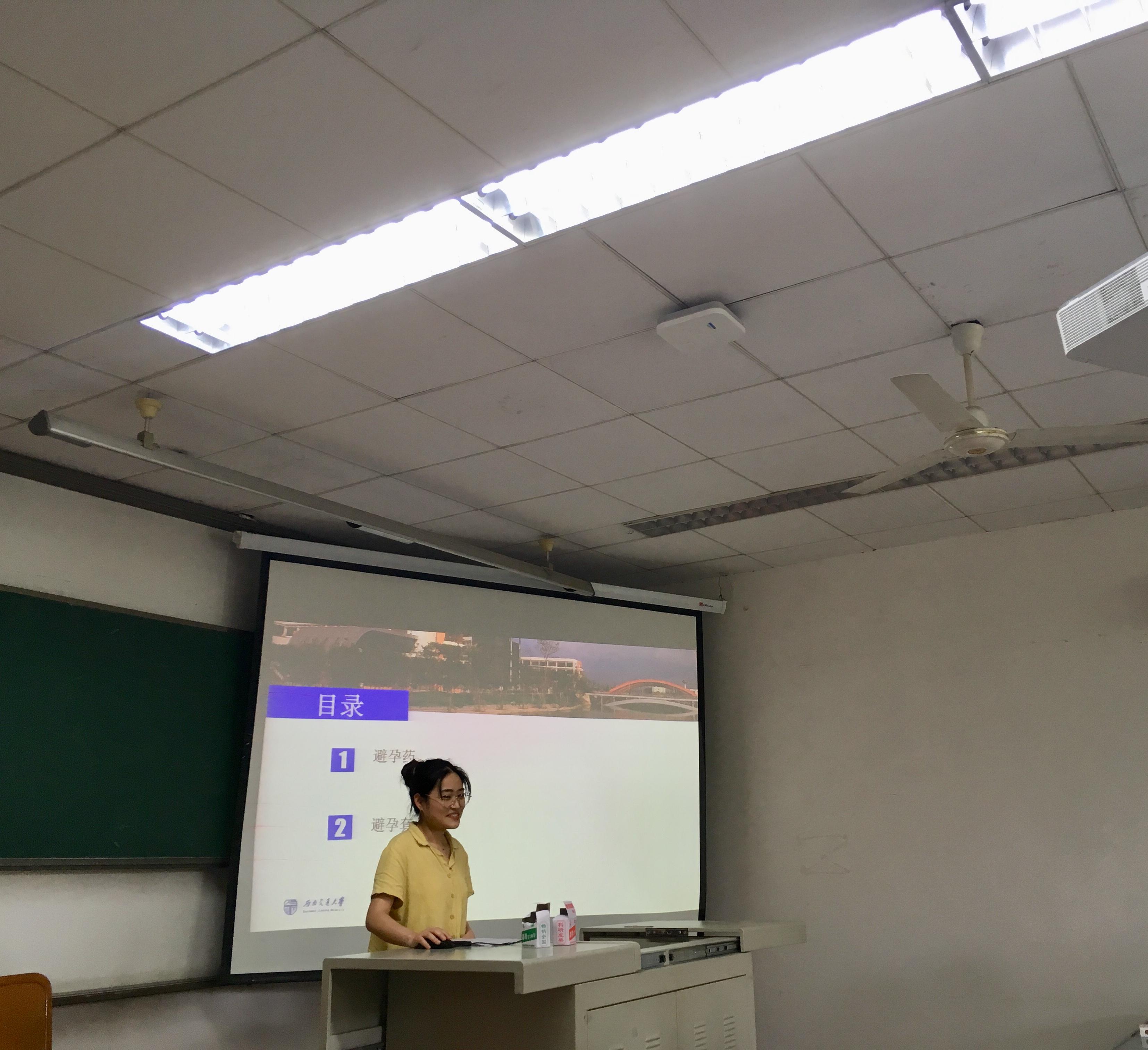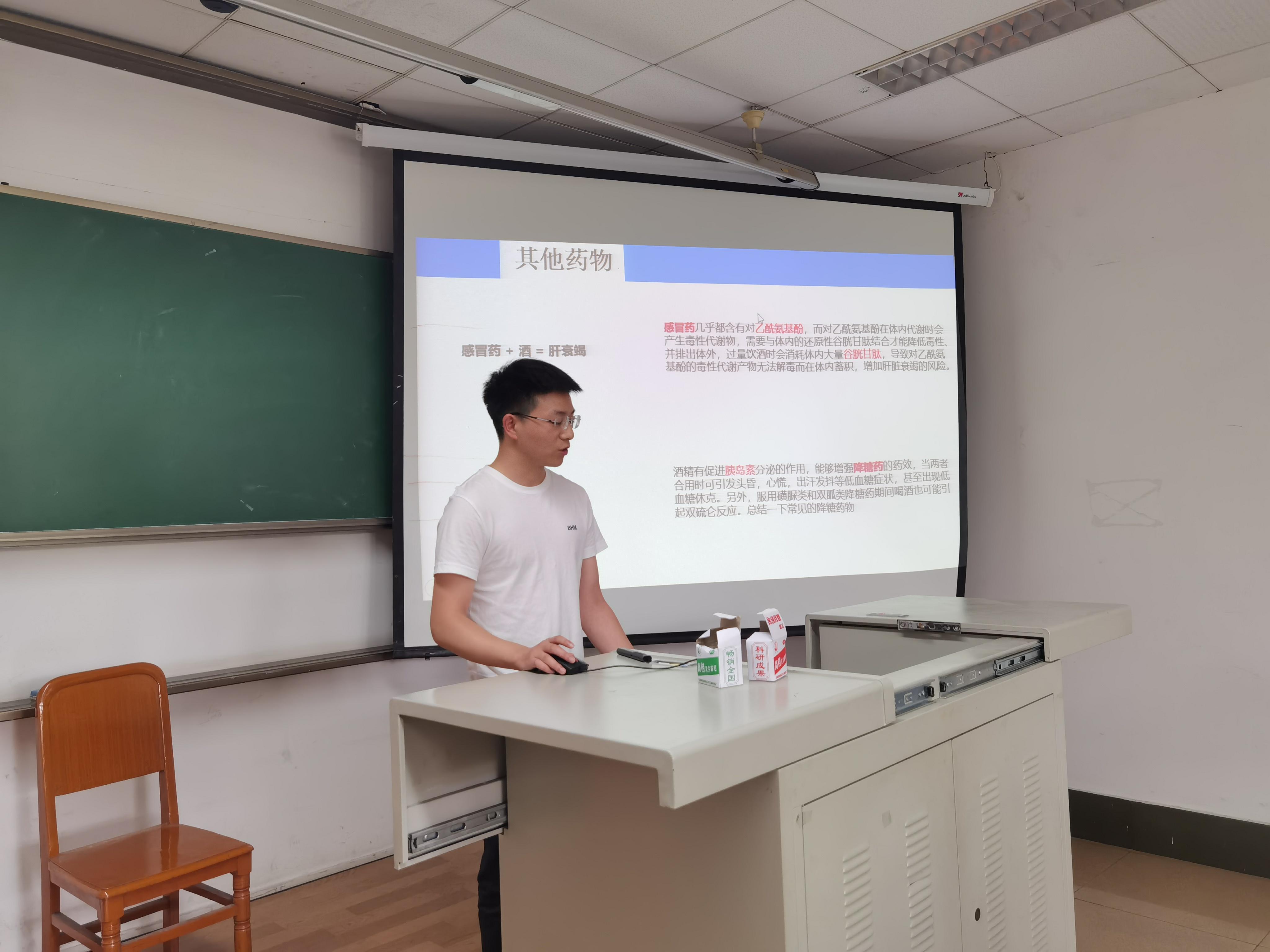活动由张婕鑫主持,并由梁琦和何志弦分别向全体同学介绍了“酒精引发的药物不良反应”和“避孕小知识”两则用药常识。