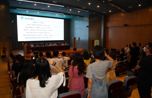 建设与发展、为学生们成长成才无私奉献的老师们的感谢。最后,全体医学新生集体宣读医学生誓词,开学典礼第一阶段在铿锵的医学生誓言中结束。