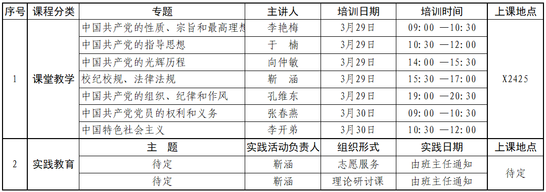 1、培训实行课堂教学、实践教学和自主学习相结合的培养方式。课堂教学由分党校聘请党课教师主讲,实践教学由班主任组织进行,自学学习可与学生时事政策教育、党团活动等环节相结合。