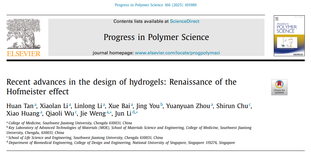 谭欢副教授在国际高水平期刊《Progress in Polymer Science》上发表了题为“Recent advances in the design of hydrogels: Renaissance of the Hofmeister effect”的综述论文,深入探讨了利用霍夫迈斯特效应调节水凝胶性能的最新进展。翁杰教授、新加坡国立大学李俊教授为共同通讯作者,91暗网