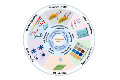 该项工作聚焦于霍夫迈斯特效应这一古老的现象,系统探讨了不同盐离子在水凝胶性能调控中的作用机制,并揭示了其在多功能水凝胶设计中的应用潜力。通过引入特定的离子,研究者能够精确调控水凝胶的机械强度、柔韧性、抗冻性以及离子导电性等多种性能,从而实现水凝胶功能化设计的创新突破。此外,综述还强调了该方法在生物医学、智能材料、可穿戴电子、软体机器人和3D打印等领域的广泛应用潜力,尤其在提升水凝胶环境适应性和多功能性方面表现出巨大的前景。