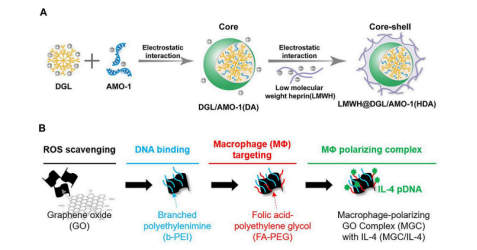 图3:(A)低分子肝素(LMWH)包被聚赖氨酸(DGL)用于局部微血栓形成(B) peg修饰的氧化石墨烯用于实现m2型巨噬细胞极化。