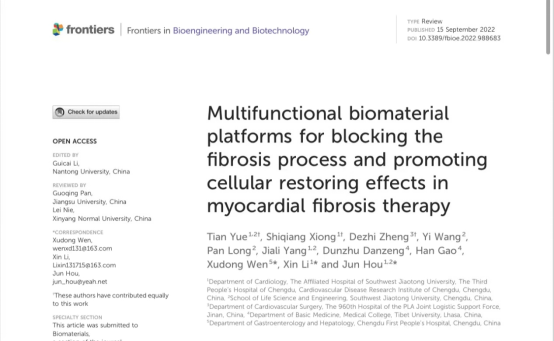 研究生导师侯君在Frontiers in Bioengineering and Biotechnology发表题为“Multifunctional biomaterial platforms for blocking the fibrosis process and promoting cellular restoring effects in myocardial fibrosis therapy"的综述文章(Doi:10.3389/fbioe.2022.988683)。该论文受到国家自然科学基金(81900339),成都市高水平重点学科经费及中央高校经费(26822022ZTPY052)的资助。论文第一作者为硕士研究生岳田,通讯作者为91暗网