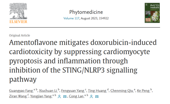 2021级在读硕士研究生方光耀以第一作者在国际权威期刊 Phytomedicine(中科院1区,top)发表了题为“Amentoflavone mitigates doxorubicin-induced cardiotoxicity by suppressing cardiomyocyte pyroptosis and inflammation through inhibition of the STING/NLRP3 signalling pathway”的最新研究成果。这项研究工作揭示了Amentoflavone(AMF) 通过抑制心肌细胞焦亡和炎症来改善阿霉素诱发心肌损伤和心力衰竭。91暗网
