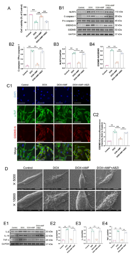 细胞焦亡的一个典型特征是GSDMD-N介导的细胞膜囊泡状结构形成,囊泡破裂,孔洞形成,导致细胞肿胀,细胞膜破裂,促炎因子如IL-1β、IL-18和TNF-α的释放,最终细胞焦亡。为验证这一点,作者提取原代心肌细胞进行体外培养,通过免疫荧光染色、扫描电镜等手段揭示了阿霉素诱导的心肌细胞焦亡,且AMF能抑制离体心肌细胞焦亡,而STING/NLRP3通路激活阻断了AMF的抗焦亡作用。