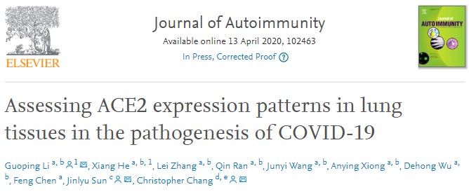 附属医院(成都市第三人民医院)成都市呼吸健康研究所李国平主任带领团队利用生物信息学方法解析了新型冠状病毒SARS-CoV-2细胞受体ACE2的表达模式,并以第一作者和通讯作者身份在国际著名免疫学期刊《Journal of Autoimmunity》(中科院1区,影响因子7.54)在线发表了题为《Assessing ACE2 expression patterns in lung tissues in the pathogenesis of COVID-19》的文章。该研究可帮助临床医生和研究人员对SARS-CoV-2的发病机理有更深入的了解,并为新型冠状病毒肺炎(Corona Virus Disease 2019,COVID-19)治疗提供重要的理论依据。