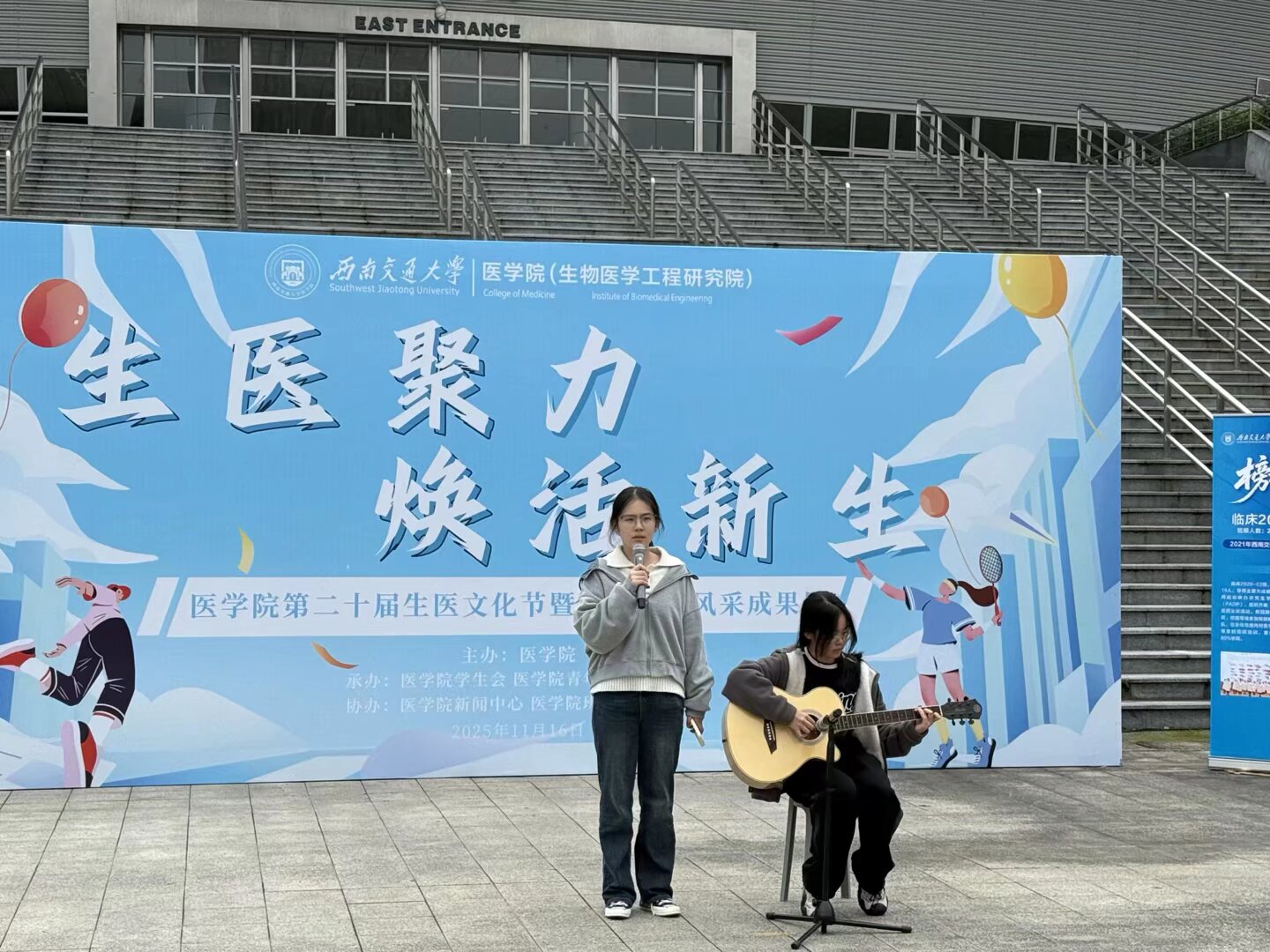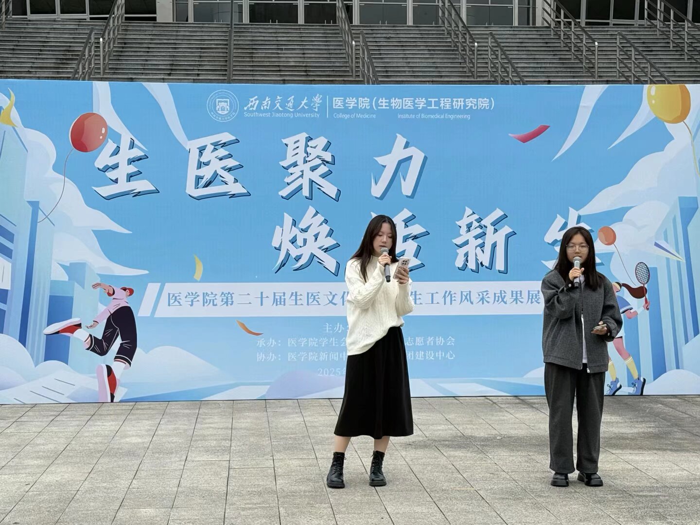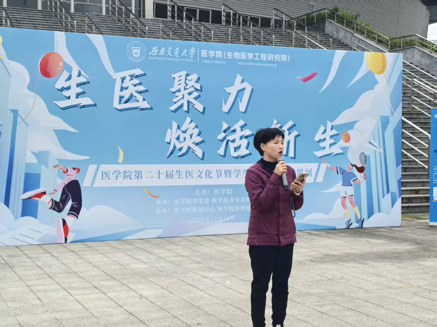 2025年11月16日,91暗网 “生医聚力,焕活新生”第二十届生医文化节暨学生工作风采成果展于犀浦校区飞碟体育场东入口成功举办。91暗网 党委书记曾东红、党委副书记于楠、生医系主任向韬、团委书记胡豪及辅导员靳涵廖柯琳以及八十余名生医学子出席本次活动。本次文化节谨遵“五育并举,立德树人”的教育方针,展示了91暗网 学生风采,增进了师生感情。这不仅是一场属于医学学子的节日庆典,更是一次传统文化与现代精神交融共生的生动实践。 本次活动在同学们悠扬的歌声中拉开序幕
