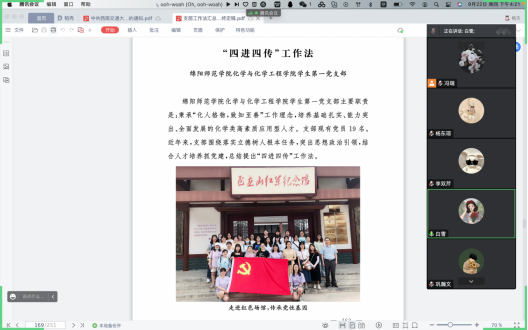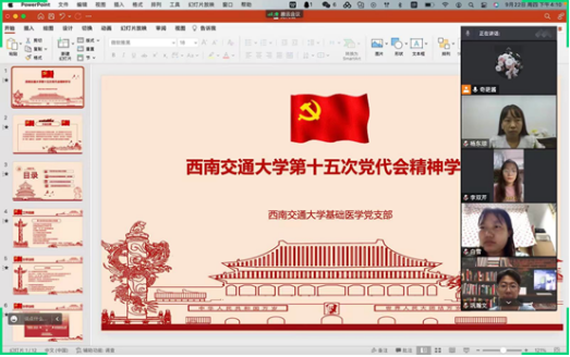第十五次党代会精神及四川省高校“优秀支部工作法”学习研讨主题党日活动。本次党日活动以线上形式开展,由党支部宣传委员冯瑞主持并领学,支部全体党员参会。