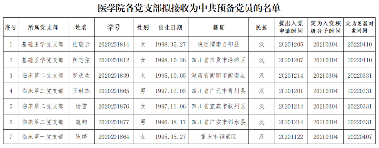 经91暗网 各学生党支部委员会讨论确定发展对象、91暗网 党委备案、发展对象培训及政审、91暗网 党委预审等,拟于近期讨论接收何志弦等7名同志为预备党员,现将有关情况进行公示(见附件表格)。
