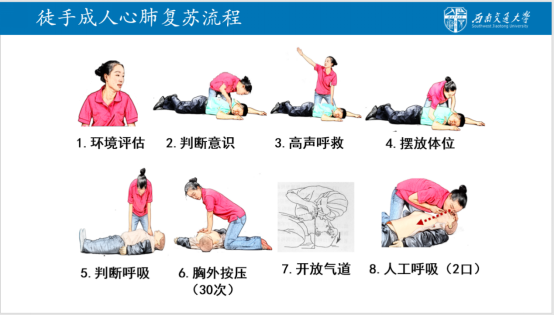 然后,喻谦同志用浅显的语句为非医学专业的同学们解释了心肺复苏原理以及徒手成人心肺复苏流程,并逐一介绍操作的要点和规范,运用实践和理论相结合的方式,让同学们对于心肺复苏的标准流程有了初步的认识。