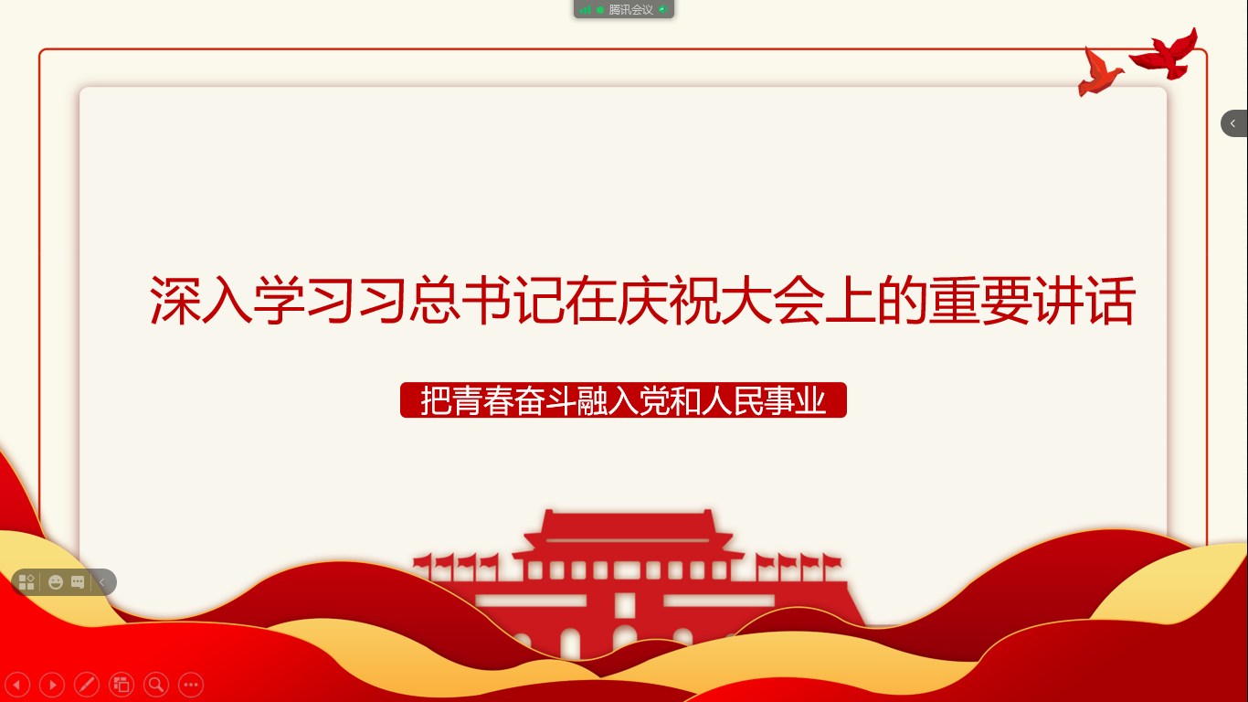 首先,由李双芹同志带领大家重温习总书记在庆祝中国共产党成立一百周年大会上的讲话。习总书记在讲话中寄语青年:新时代的中国青年要以实现中华民族伟大复兴为己任,增强做中国人的志气、骨气、底气,不负时代,不负韶华,不负党和人民的殷切希望。青年是祖国的未来、民族的希望,未来属于青年,希望寄予青年。