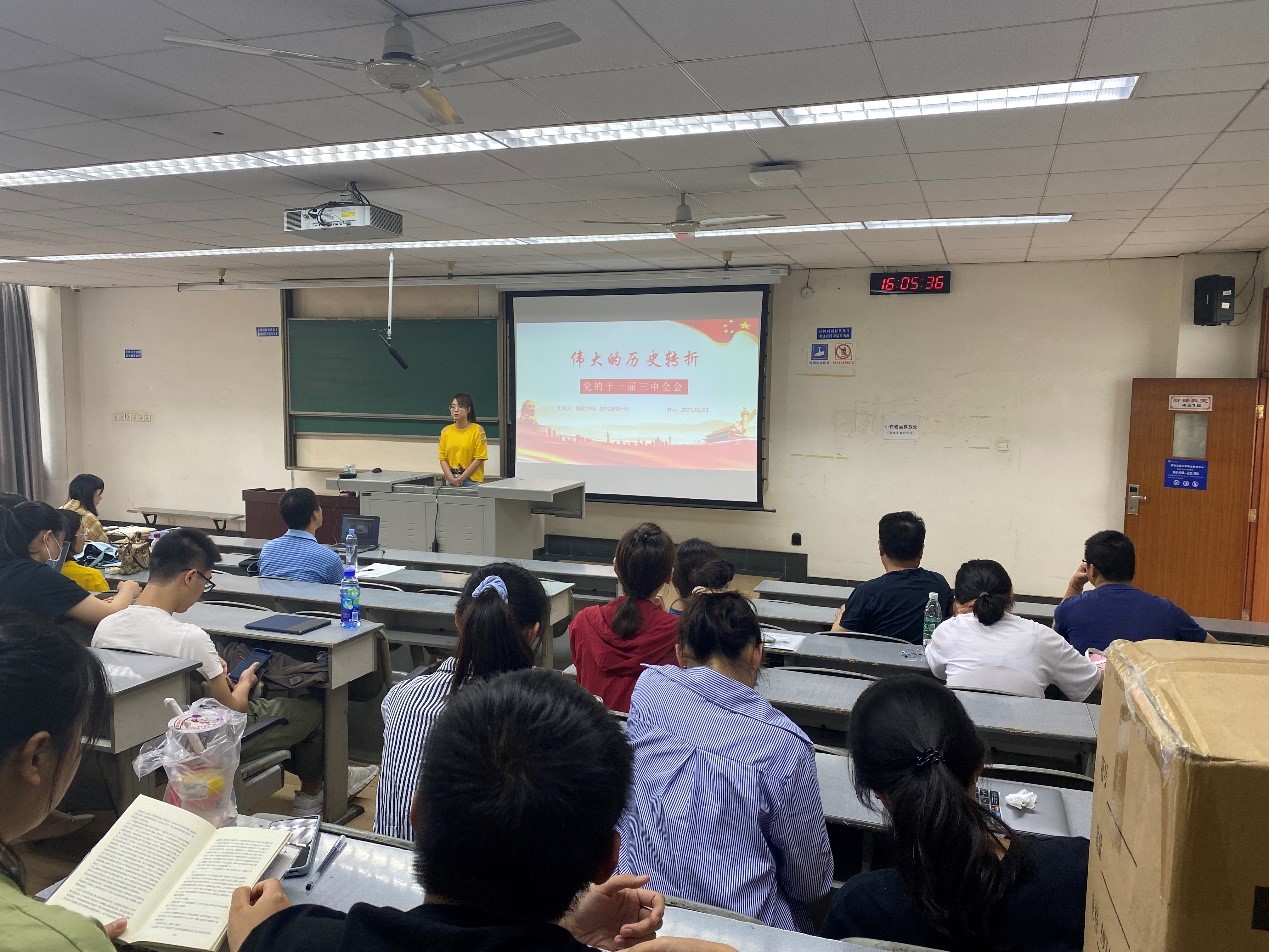 基础18、19级党小组宋可可同志分享了十一届三中全会,分享由“两个凡是”、“真理标准的讨论”、“民主与法制建设的加强”三部分组成。十一届三中全会的伟大历史意义就在于它使中国走上改革开放、建设中国特色社会主义的正确道路;是共和国历史发展进程中的一次伟大转折。中共十一届三中全会以后,平反冤假错案的工作在全国全面展开,1982年底基本结束。1980年,中共中央撤消了强加给刘少奇的种种罪名,恢复名誉,使党的历史上最大的冤案得到平反。而家庭联产承包责任制提高了农民的生产积极性,解放了农村的劳动力,促进了农村经济的恢复和发展,促进了乡镇企业的发展。