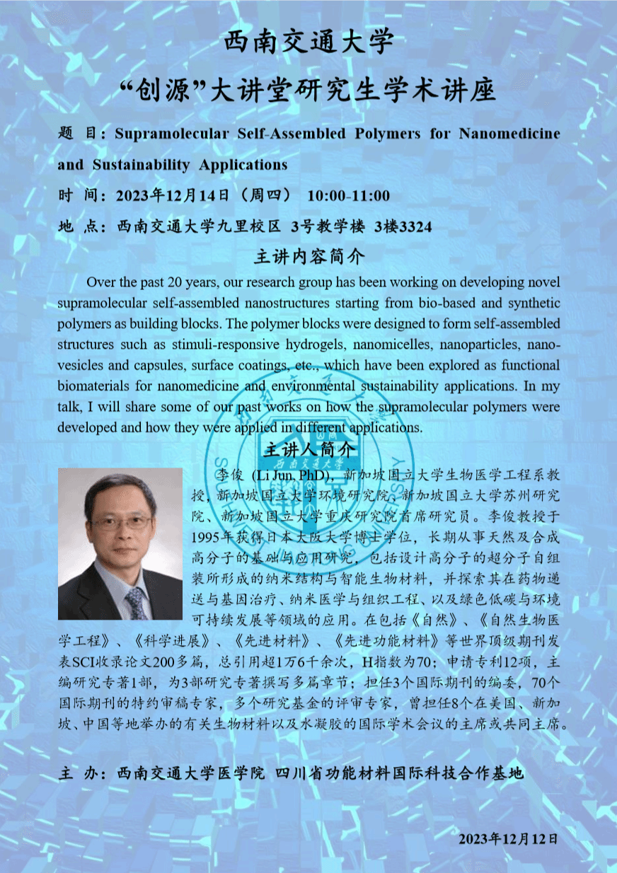 “创源”大讲堂:Supramolecular Self-Assembled Polymers for Nanomedicine and Sustainability Applications