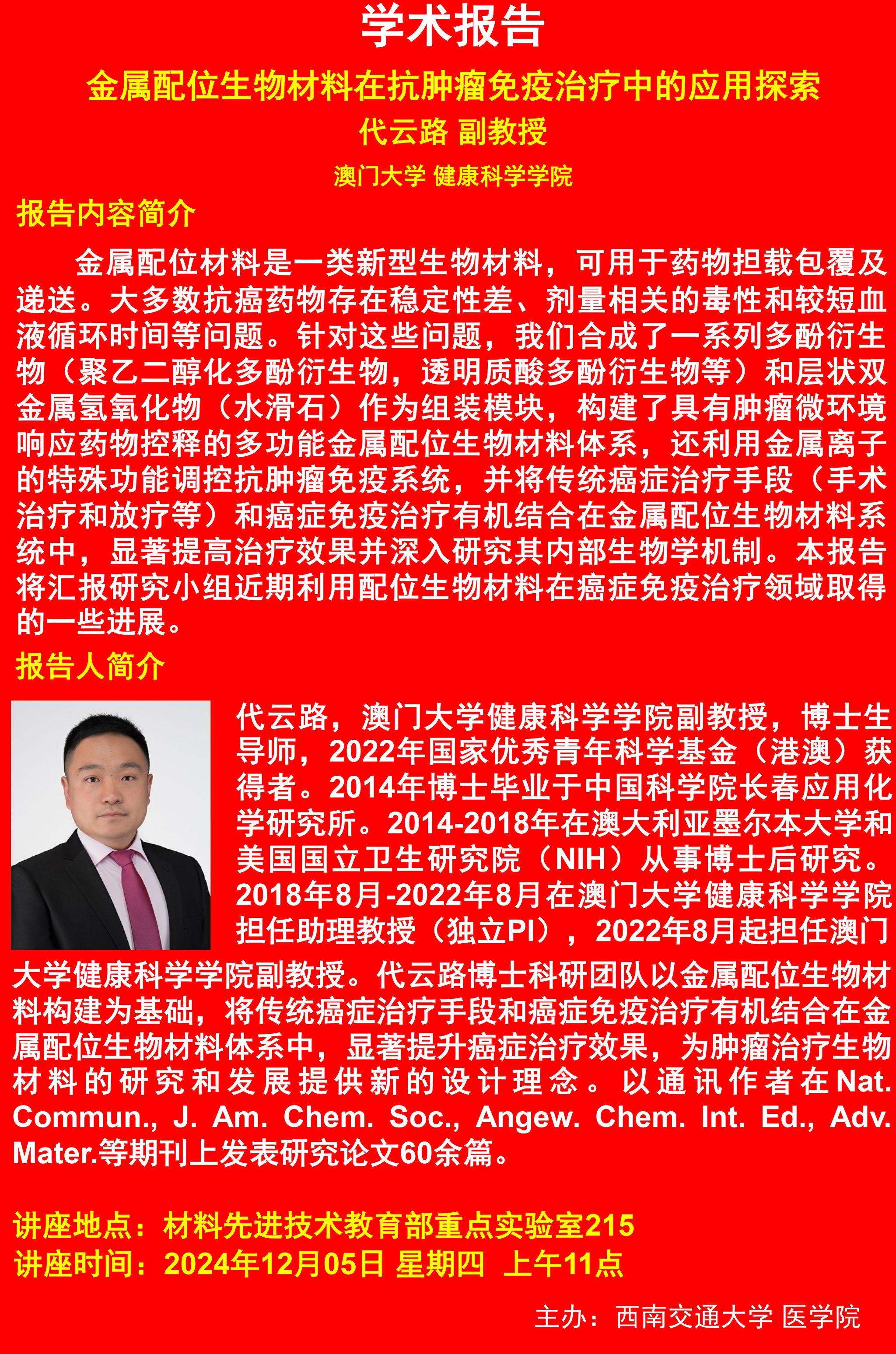 副教授。代云路博士科研团队以金属配位生物材料构建为基础,将传统癌症治疗手段和癌症免疫治疗有机结合在金属配位生物材料体系中,显著提升癌症治疗效果,为肿瘤治疗生物材料的研究和发展提供新的设计理念。以通讯作者在Nat. Commun., J. Am. Chem. Soc., Angew. Chem. Int. Ed., Adv. Mater.等期刊上发表研究论文60余篇。